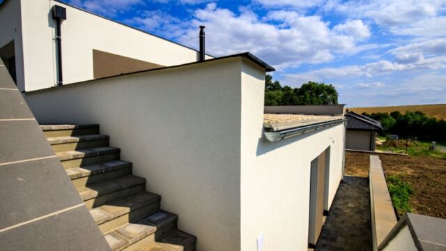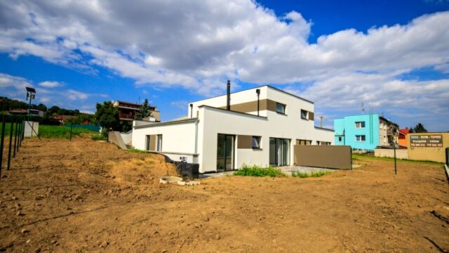 Celková plocha parcely činí 474 m2, garáž o vel. 34,56 m2, zastavěná plocha domu 109 m2, podlahová plocha 123,6 m2 vč. garáže. Jedná se o dvoupodlažní rodinný dům, který je vzhledem k mírné svažitosti terénu částečně zapuštěný do svahu. Zdivo z pórobetonových tvárnic 300 mm. Střecha rovná betonová, zateplení střechy spádovým polystyrenem, krytina PVC. Stropy betonové. Vytápění domu zajišťuje teplovodní podlahové topení a ohřev teplé vody úsporný bojler. Dům je nízkoenergetický, třídy energetické náročnosti C, postavený z kvalitních trvanlivých materiálů.