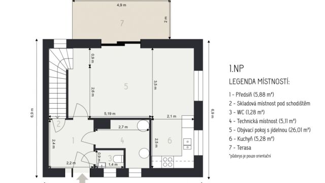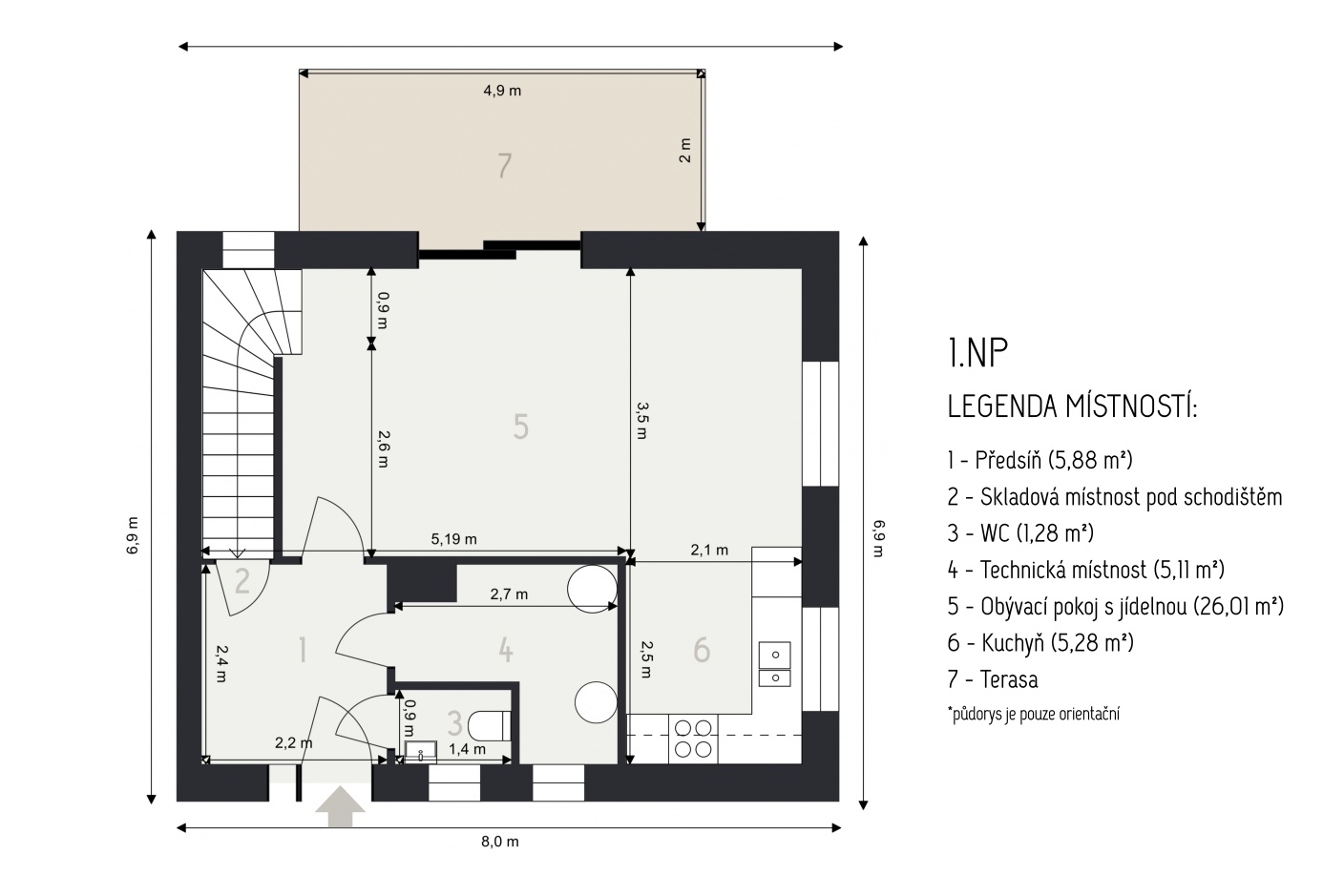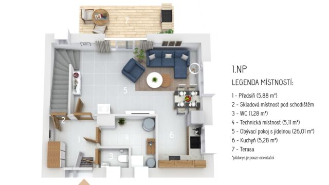 1. NP obývací pokoj s jídelnou: 26,01 m² kuchyň: 5,28 m² předsíň: 5,88 m² technická místnost: 5,11 m² WC: 1,28 m²