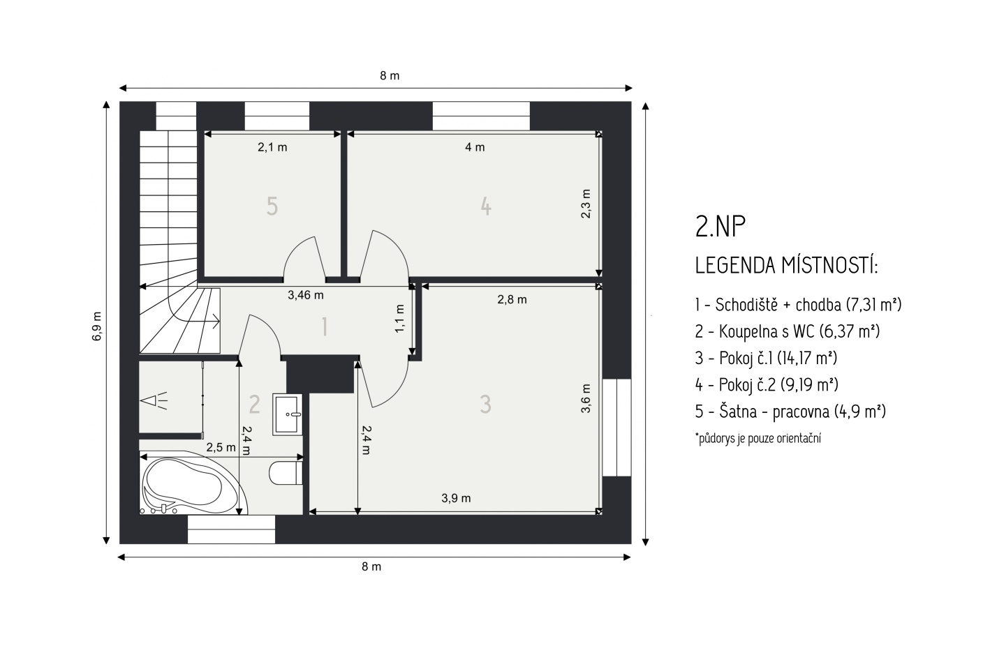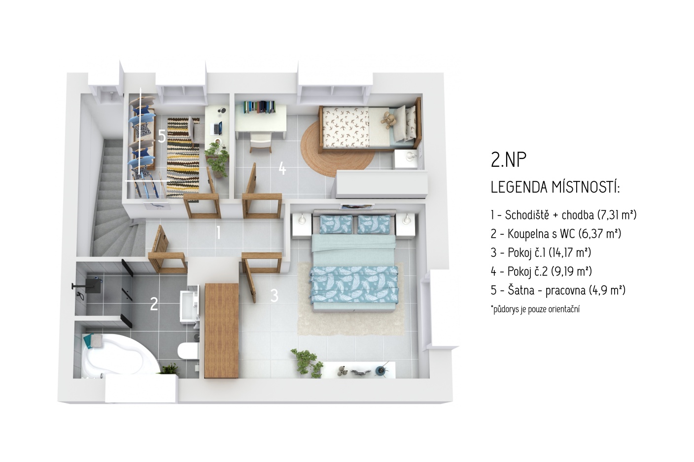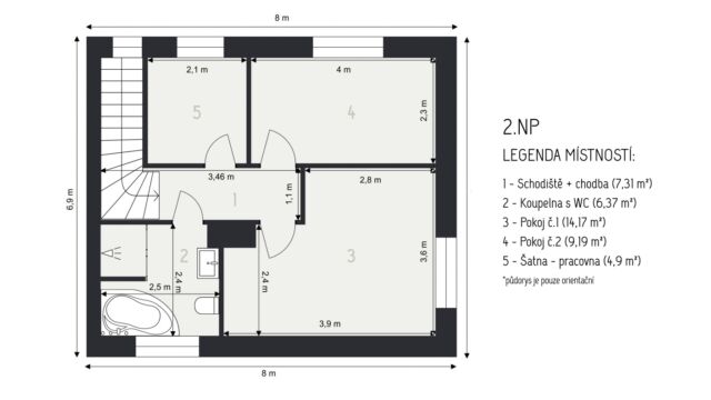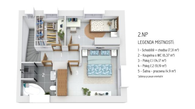 2. NP ložnice: 14,17 m² pokoj: 9,19 m² šatna / pracovna: 4,90 m² koupelna s WC: 6,37 m² (vana i sprchový kout) chodba se schodištěm: 7,31 m²